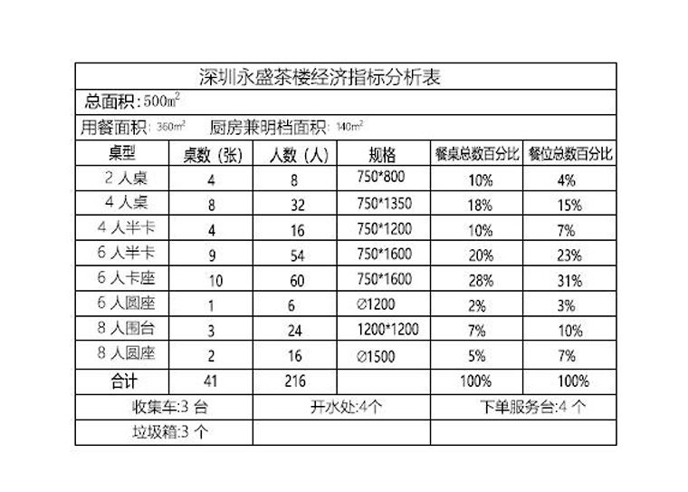 2、坪效計算:坪效重點就是考慮位置的利用率和位置的分布狀況。通過我們的研究發現,深圳、廣州等地茶樓用餐座位利用率最高的多數是4人位和6人位。而在上海等地,最多應該是4人位和2人位。我們不僅要關注位置的數量,更應該綜合考慮位置的利用率。如果長期出現4個人的客人卻使用6人桌位,說明位置的實際實用率才70%而已,這是極度不合理的坪效。我們悅得閑的餐區位置6人位為主,4人位可以臨時拼接成8人位,甚至更多的位,滿足顧客的多樣化需求,提升餐區的位置利用率。
