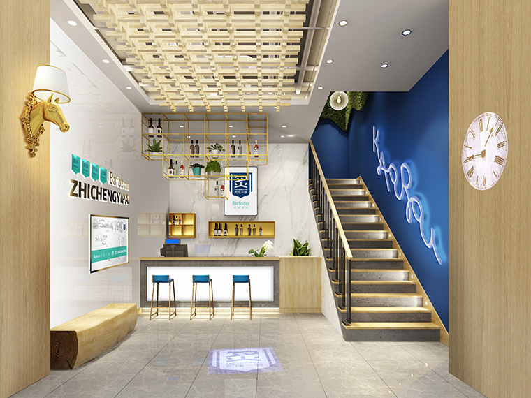 3、家具軟裝:家具是餐飲室內環境的重要部分,因為占地面積大,并且與顧客的接觸最為密切。所以,家具的造型和色彩對餐廳的整體氛圍起著極其重要的影響。炙成一派的家具選擇了與品牌色接近的天藍色,椅子的款項選擇新中式的梳背圈椅,舒適度高,且與整體的空間氛圍極為相稱。其他軟裝如花藝,小包枕,窗簾等,體現空間藝術裝飾性及舒適度之余,還具有趣味性和品牌軟性宣傳。