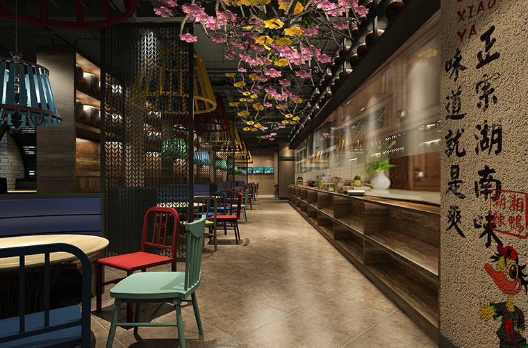 4、裝飾品、雕塑擺件、工藝品、畫藝軟裝。現在的餐廳,主題性越來越強烈鮮明,比如流行的校園烤魚餐廳,喜歡用大量80、90年代的舊電視、鳳凰自行車,表達對時光的追憶;在當下一些更古典的餐廳如桂滿隴等,大量使用小橋流水,輕舟古船、古琴書法藝術等在,江南風格極為鮮明。但成本高昂,偏離餐飲本質。品深餐飲設計曾經做過的丑小丫湖南菜館,原創設計了丫哥、丫妹造型,并且把這個造型在空間以雕塑形式出現,讓消費者合影,軟裝效果很好。