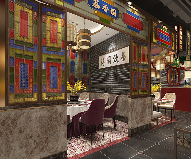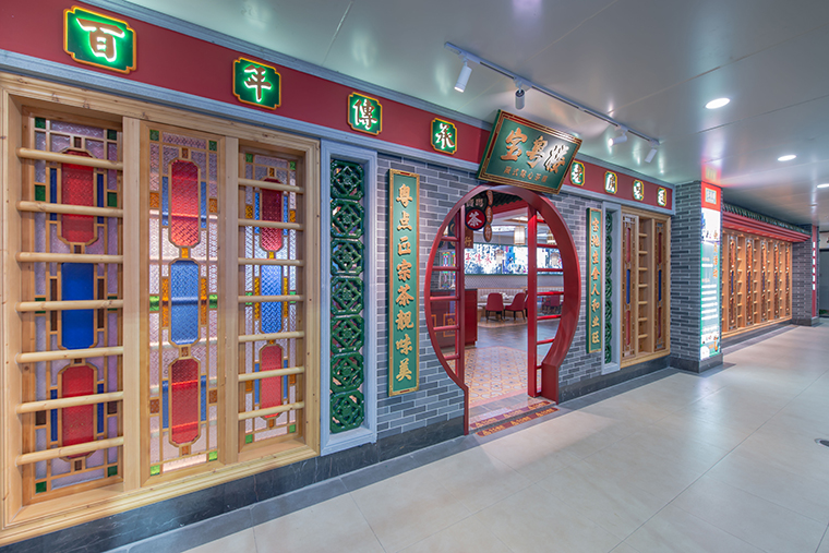 廣式花窗,又稱為滿洲窗。源自于廣州最開始與外國開展海外貿易,是典型的舶來品。滿洲窗不同的款式和花紋組合體現了使用者的生活富足與審美情趣。廣式花窗可以很好的表現廣式點心茶樓的品類屬性,具有一目了然,一見如故的特性。在寶粵樓的空間設計中,我們將廣式花窗大面積使用門口兩側的主形象,包房隔斷、甚至天花吊頂上,形成了強烈的視覺沖擊力,具有鮮明的老廣州西關韻味。
