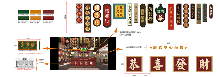 寶粵樓的VI體系,包含了品牌的LOGO標志圖形,品牌主色調,店內日常運營的物料系統,導視系統,推廣廣告系統等幾個方面。