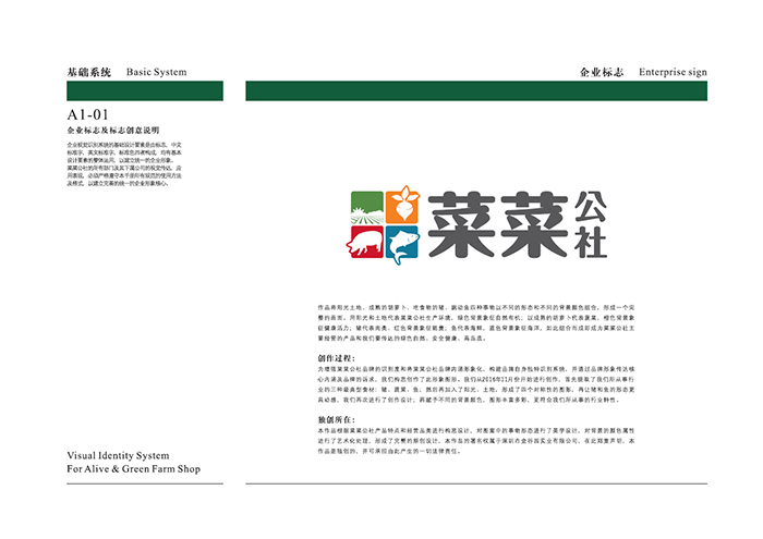 將陽光土地、成熟的胡蘿卜、吃食物的豬、跳動魚四種事物以不同的形態和不同的背景顏色組合,形成一個完整的畫面。用陽光和土地代表菜菜鮮語生產環境,綠色背景象征自然有機;以成熟的胡蘿卜代表蔬菜,橙色背景象征健康活力;豬代表肉類、紅色背景象征能量;魚代表海鮮,藍色背景象征海洋,如此組合而成即成為菜菜鮮語主要經營的產品和我們要傳達的綠色自然、安全健康、高品質。