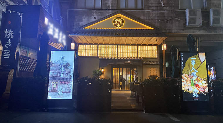 比如玉椿燒鳥居酒屋的門頭,使用京都古建筑的山墻造型,中間裝飾“椿”的家徽,既表達(dá)品牌名稱,又有強(qiáng)烈的復(fù)古氣質(zhì),極具日本江戶時代特征。中間一排玻璃磚是整個門頭的點(diǎn)睛之筆,方形玻璃磚,厚度達(dá)到50MM,燈光照射下有一種晶瑩剔透的視覺感受,現(xiàn)代時尚氣息濃厚。方形玻璃磚與門頭的復(fù)古氣質(zhì)形成強(qiáng)烈對比。古典與現(xiàn)代碰撞,迸發(fā)出耀眼的視覺火花,消費(fèi)者的眼光一下子就被吸引過來,并且迅速產(chǎn)生了一種迫切想進(jìn)店的消費(fèi)沖動。這就是借助造型藝術(shù)體現(xiàn)品牌屬性,靈活使用裝飾材質(zhì)的特性,實(shí)現(xiàn)了古典與現(xiàn)代的交融。