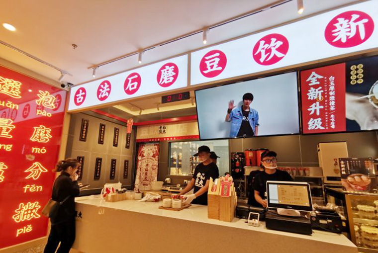 采用加拿大大豆,以古法石磨研磨豆?jié){,相對機器研磨,石磨研磨豆?jié){更香醇濃郁,石磨放置于品牌門店前,顧客能看到的位置,目的是