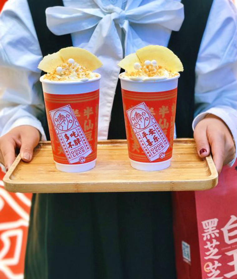 注重儀式感,豆?jié){出品前用一串日本白玉丸子橫在杯子上,并撒上豆粉,儀式感滿滿,白玉丸子蘸上香濃豆粉與奶蓋,先吃軟糯白玉串燒,再喝綿密的豆乳奶蓋,成功地把豆?jié){變成能吃的豆乳茶,引來顧客爭相拍照打卡,一時間成為網(wǎng)紅產(chǎn)品。