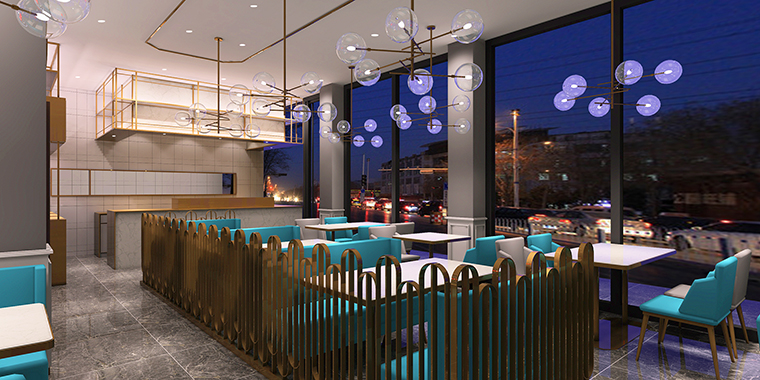 港灣茶餐廳內(nèi)部裝飾盡量簡潔為主,沒有繁復(fù)的線條,整裝護(hù)墻板采用高級灰,時尚感強(qiáng),藍(lán)綠色的招牌外觀,純鐵藝格柵,金色鍍銅架,整體氛圍休閑時尚,富有網(wǎng)紅特質(zhì)。