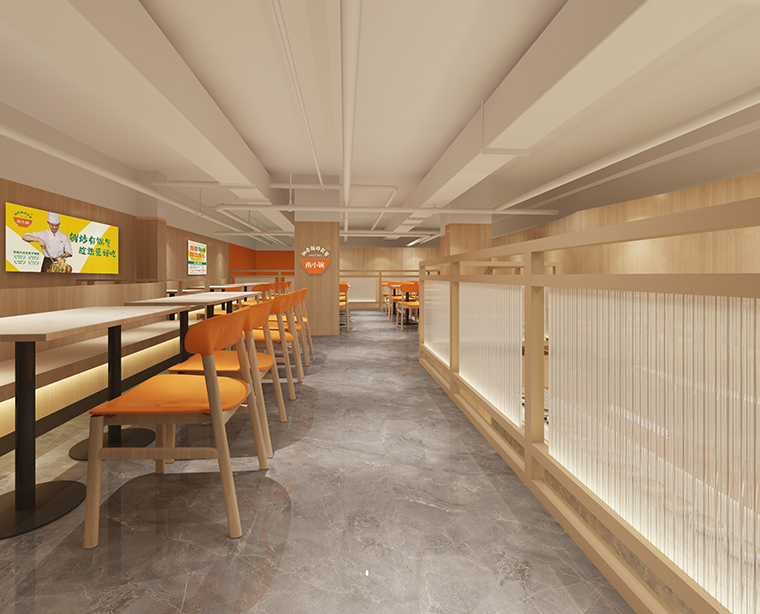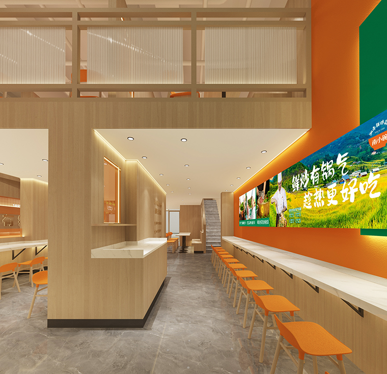 3、內(nèi)部使用大面積的橙色體現(xiàn)鮮炒有鍋氣的特點(diǎn),橙色既使人產(chǎn)生一種陽光熱情的心里感受,又是現(xiàn)炒時(shí)火焰的顏色,體現(xiàn)了現(xiàn)炒的特性,識(shí)別度非常高。整面墻的木色板材,木色有自己獨(dú)特的質(zhì)感、在空間中又更有親和力,在狹窄的簡餐空間中也會(huì)讓人感受到輕松,給人一種可釋懷的愉悅,讓人隨時(shí)隨地都能感受到大自然的生機(jī)。