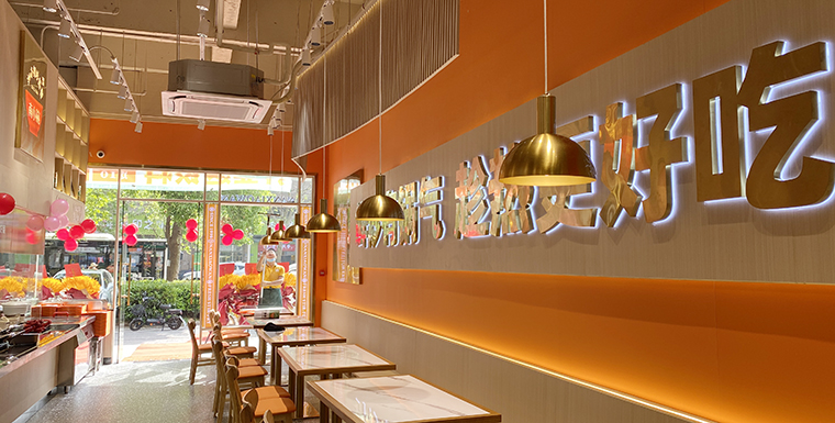 2、門口大面積落地玻璃、墻面使用板材,白色大理石臺(tái)面、灰色地面、木色桌面,橙色亞克力板。整個(gè)空間追求明亮、整潔、舒適的視覺感受。尤其是門口的落地玻璃,窗明幾凈,讓路過的消費(fèi)者都能看見店內(nèi)熱火朝天的狀態(tài),鍋氣繚繞的煙火氣,產(chǎn)生強(qiáng)烈的進(jìn)店沖動(dòng)。
